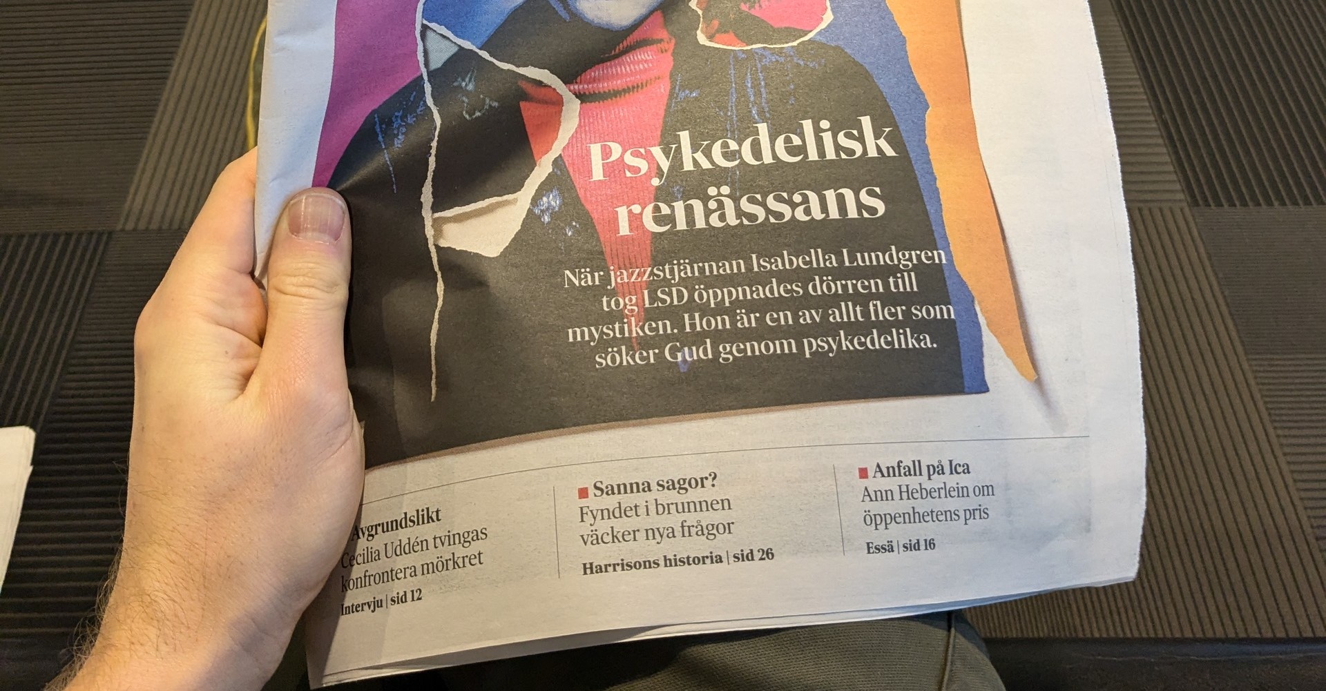 Svenska Dagbladet publicerade nyligen ett långt reportage om psykedelika och andlighet. Jazzsångerskan Isabella Lundgren intervjuas om sina erfarenheter, med bl.a. det bevingade citatet “Om det är något jag kan säga om de här substanserna så är det att de drar ner byxorna på hela det performativa spelet.” Även Pehr Granqvist och vår egen Filip Bromberg ger sina perspektiv på temat. Du hittar artikeln i sin helhet via vår hemsida.