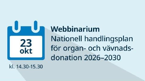 Den 23 oktober publicerar Socialstyrelsen den nationella handlingsplanen för organ- och vävnadsdonation 2026–2030.Samma dag hålls ett öppet webbinarium kl. 14.30–15.30, där Socialstyrelsen presenterar planens innehåll och hur arbetet kommer att följas upp.