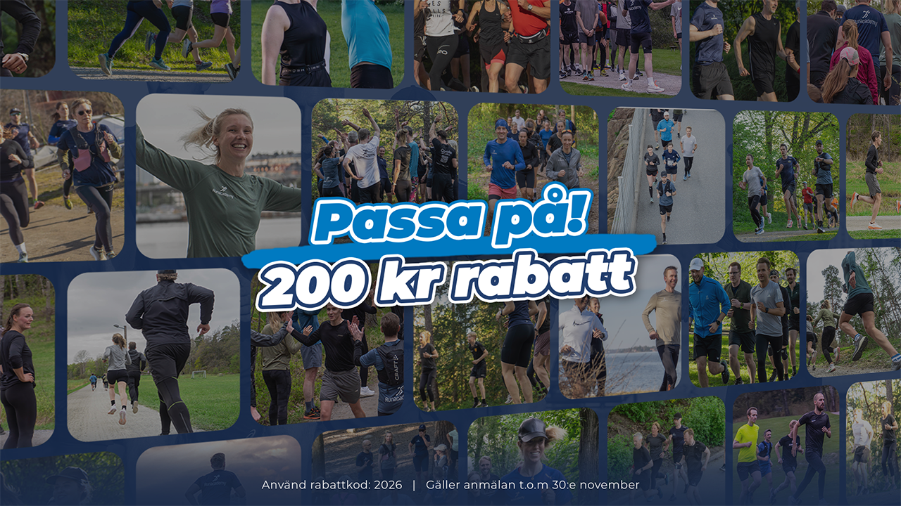 Anmäl dig senast den 30 november och använd rabattkoden 2026, så drar vi av minst 200 kr. Dessutom är du automatiskt med i utlottning av exklusiva löparprodukter och överraskningar från Runacademy och våra partners