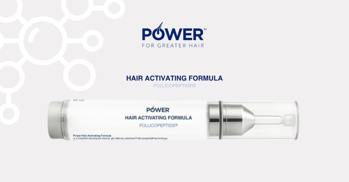 Power Hair Activating Formula er en hårvekststimulerende gel med patentert Follicopeptide®-teknologi som tilbyr en ny måte å nærme seg problemet med hårtap på. Tilgjengelig som 1-, 2-, 3- eller 5-pakning.